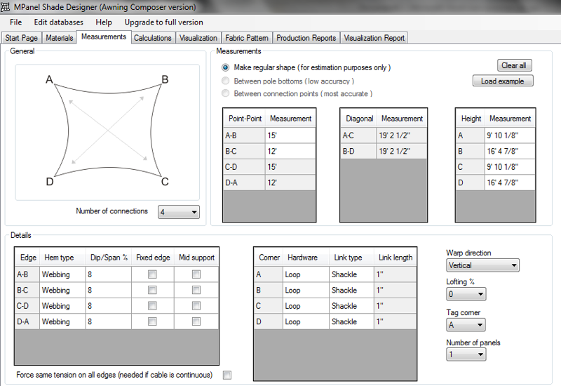 On the Measurements page enter the measurements for the sail shape. In the Awning Composer version